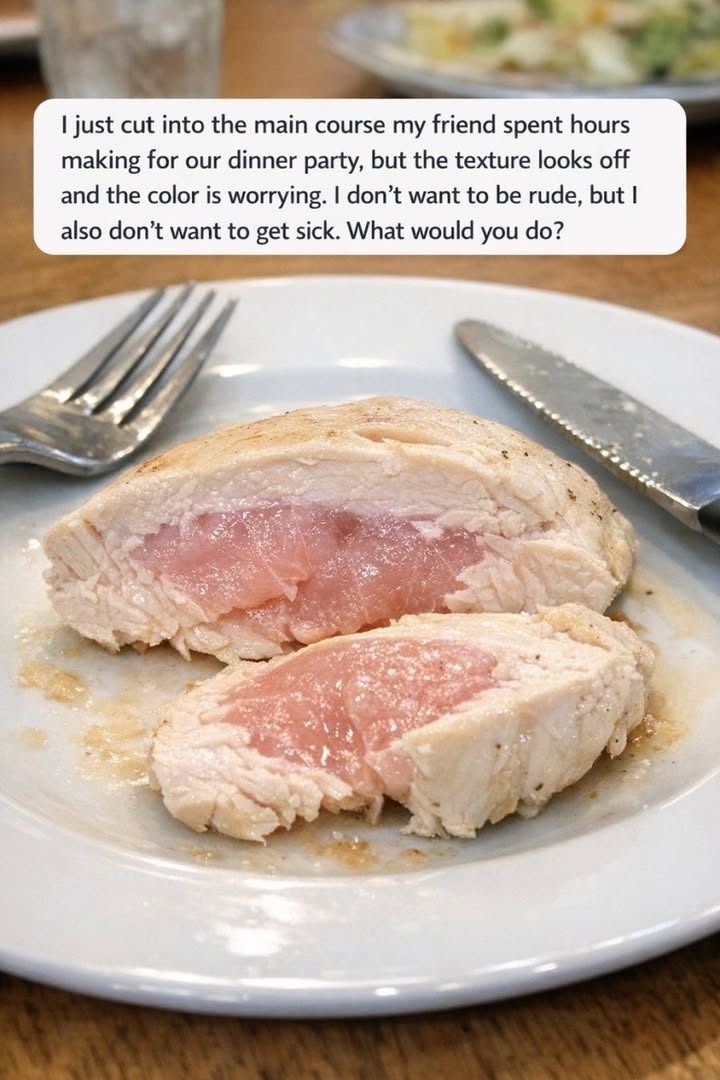 I just cut into the main course my friend spent hours making for our dinner party, but the texture looks off and the color is worrying. I don’t want to be rude, but I also don’t want to get sick. What