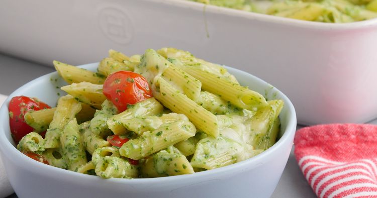 To add some extra creaminess, use heavy cream for the dish. Although this isn’t a traditional ingredient in pesto, it gives the pesto a luscious mouthfeel, and brings the whole casserole together. Kids will love the color and taste of this dish, while adults will love how quickly it comes together. If penne pasta isn’t your favorite, choose another type of pasta such as fusilli or rotini.